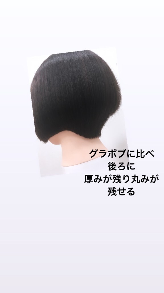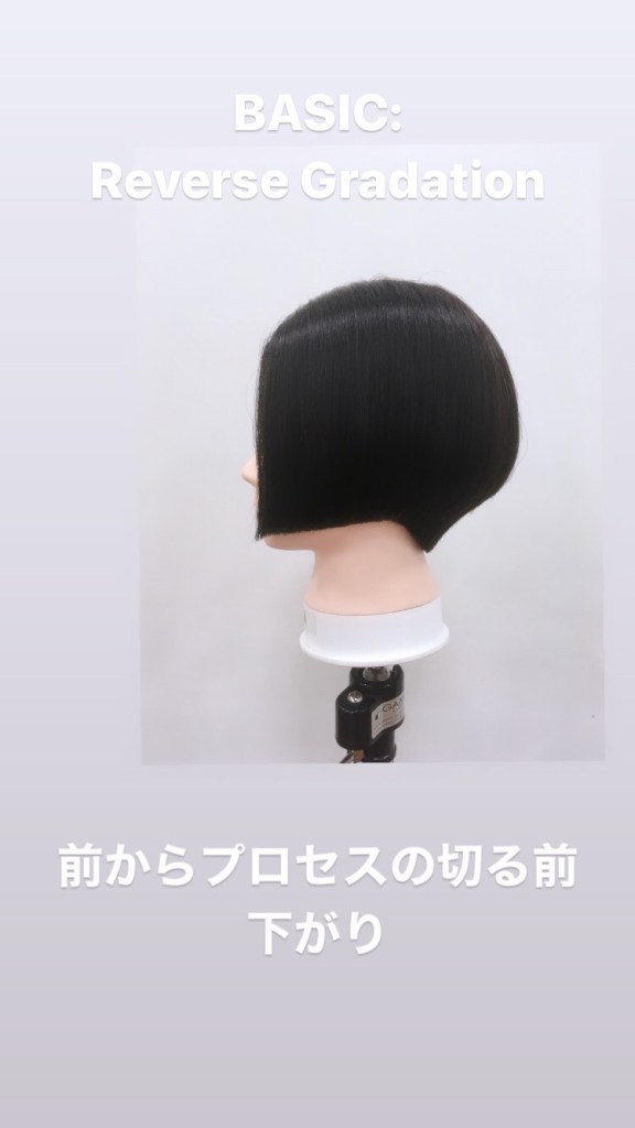 後ろからカットするプロセスの前下がりのグラボブとは違い前からカットするプロセスのリバースグラデーションは同じ前下がりでも特徴として後ろにシャープさを出さずに厚みと丸さが残せるところがポイントです。
