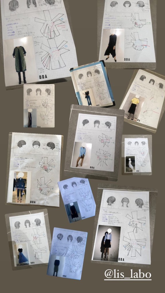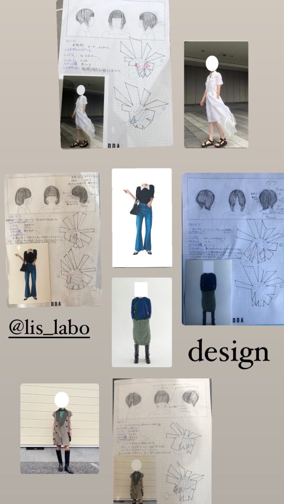 デザイン発想のためファッションや女性像のイメージを合わせてヘアスタイルのデッサンと設計図を描いてます。